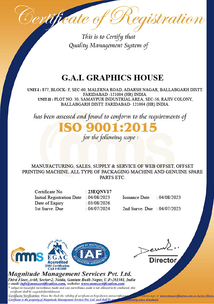 G.A.I Graphic House is an ISO 9001:2015 certified company & CRISIL rated company who believes in their customers' and end-users' satisfaction and strives for built-in quality in their products. Earnest efforts are made to meet the quality and cost expectations of the customer.